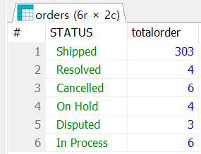 SELECT STATUS, COUNT(ordernumber) AS totalorder