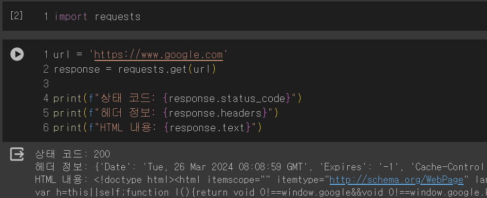 이상없이 url의 정보를 가져왔고, 이 정보들은 구글 화면에서 F12를 눌러 개발자 모드로 들어가 확인할 수 있다.