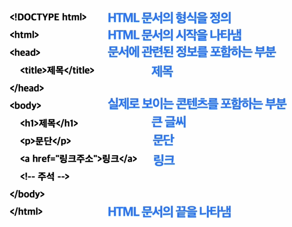 HyperText Markup Language의 준말로, 웹 페이지의 구조를 정의하고 표시하는 마크업 언어라는 의미이다.