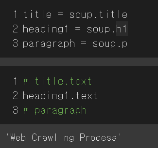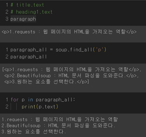 .text를 넣어 문자 부분만 가져올 수 있다. paragraph만 치면, 처음으로 오는 부분만 가져오기 때문에 문단의 모든 데이터를 가져오려면 find_all을 써야한다.