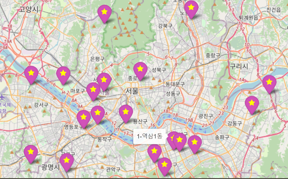 코드의 구조는 기본 맵을 만들고, 거기에 Marker를 표시해주는 식이다. 좌표는 구글링으로 확보할 수 있다.