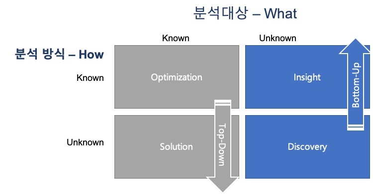 - 탐색 (Discovery) : 대상, 방법 모두 모르는 경우. 새로운 분석 대상을 탐색해야 함.