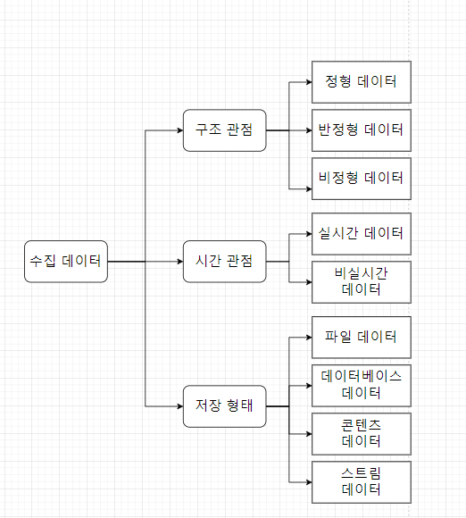 - 데이터 소스에 따른 수집 방법 : 내부 데이터 (ETL) ↔ 외부 데이터 (크롤링)
