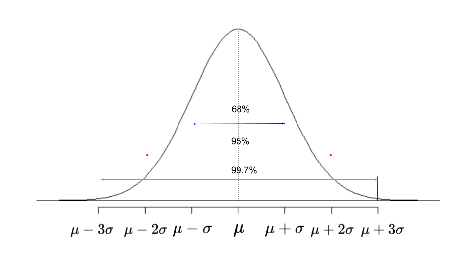 - 정규분포 (가우스 분포) : 평균이 μ (뮤)이고 표준편차가 σ (시그마) 인 x의 확률밀도함수로 종 모양으로 생긴 분포. 정규분포의 모양과 위치는 분포의 평균과 표준편차로 결정됨.