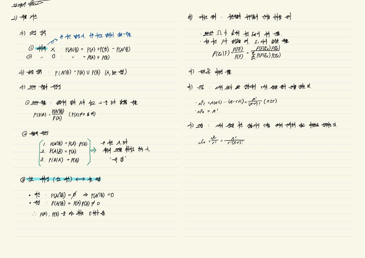- A와 B가 독립이라면 ☞ P(A∩B) = P(A) * P(B) / 배반이라면 ☞ P(A∩B) = 0