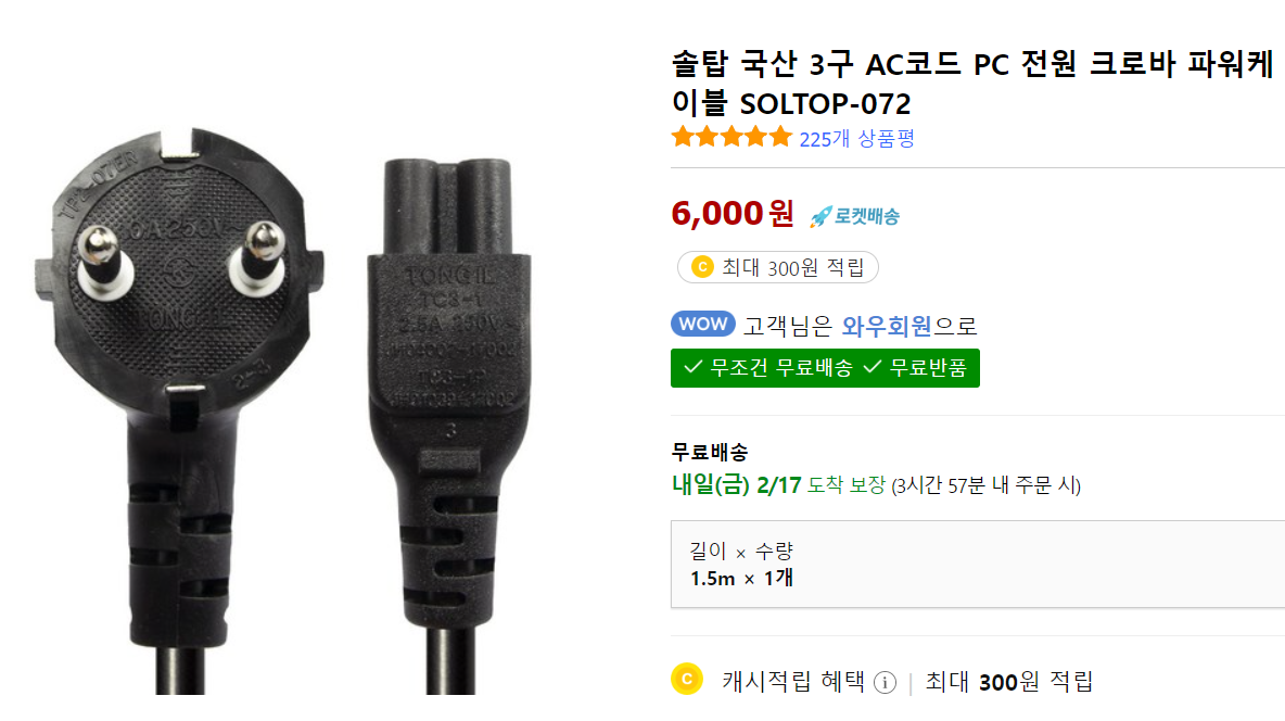 Dell 고객센터의 답변을 확인하고, 바로 쿠팡을 다시 켰다. C5 220V 전원 코드라고 검색했더니 이게 맞나 싶은 제품들이 나와서 당황스러웠다. 쿠팡 와우 회원인지라 '아니면 반품하면 되지'라는 가벼운 마음으로 국산 파워 케이블이라는 제품을 주문했다. 익일 새벽에 배송된 제품이 다행히도 필자의 노트북과 호환되는 제품이라 게시물을 작성하는 지금도 연결하여 사용하고 있다. 무사~ 해결!