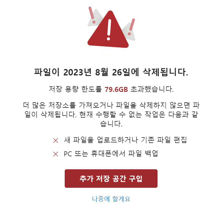 문제는 무료 혜택이 종료됨에 따라 발생하였다. 무료 기간이 종료되자 약 6개월 정도 저장 한도를 초과하여 이용할 수 없을 지도 모른다는 경고가 떴고, 2023년 2월말에 확인하였더니 삭제 경고로 변경되었다. 즉, 이용 제한 경고에서 삭제 경고로 바뀐 것이다. 삭제 일정을 고지하는데 유예 기간을 추가로 6개월 정도 부여하는 듯하다.