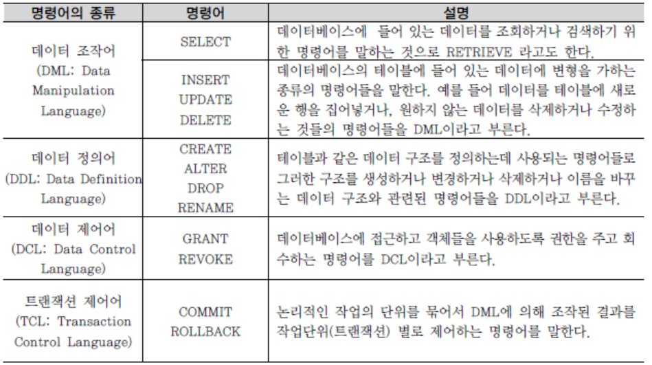- 정의 : 관계형 데이터베이스에서 조회, 데이터 정의, 데이터 조작, 데이터 제어를 하기 위해 사용하는 언어.