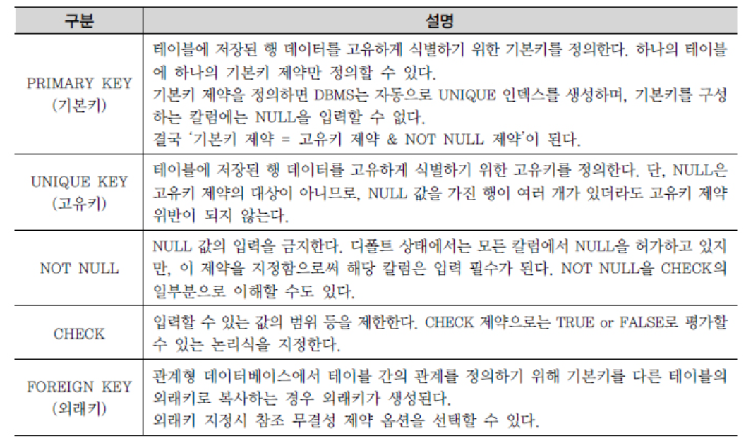 제약조건 : 사용자가 원하는 조건의 데이터, 즉, 데이터의 무결성을 유지하기 위한 데이터베이스의 보편적인 방법으로 테이블의 특정 칼럼에 설정.NULL : NULL (ASCII 코드 00번)은 공백 (BLANK, ASCII 코드 32번), 숫자 0 (ZERO, ASCII 48)과 다른 값. 공집합과도 다름. ‘아직 정의되지 않은 미지의 값’ or ‘현재 데이터를 입력하지 못하는 경우’를 뜻함.DEFAULT : 명시된 값을 지정하지 않은 경우에 NULL 값이 입력됨.