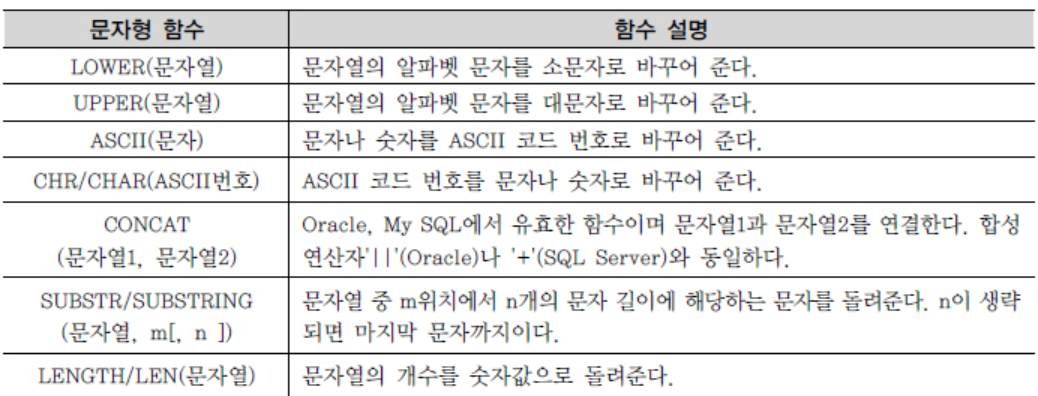 - 문자형 함수: 문자 데이터를 매개 변수로 하여 문자나 숫자 값의 결과를 돌려주는 함수.
