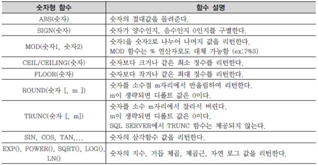 - 숫자형 함수: 숫자 데이터를 입력받아 처리하고 숫자를 리턴하는 함수.