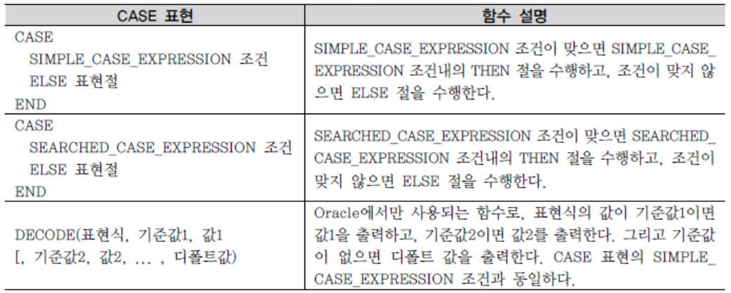 - IF-THEN-ELSE 논리와 유사하게 표현식을 작성해 SQL의 비교 연산 기능을 보완하는 역할.