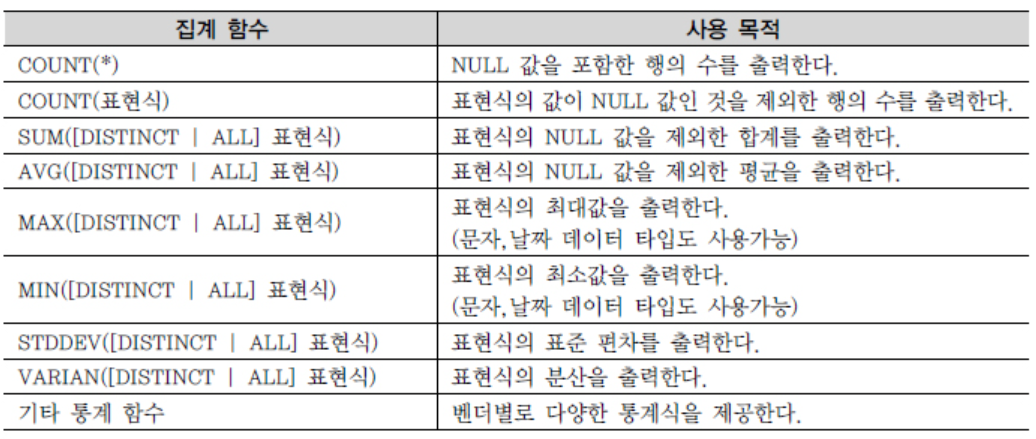 - 집계 함수의 통계 정보는 NULL 값을 가진 행을 제외하고 수행.