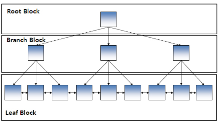 - B-트리 인덱스 : DBMS에서 가장 일반적. 브랜치 블록(Branch Block)과 리프 블록(Leaf Block)으로 구성.