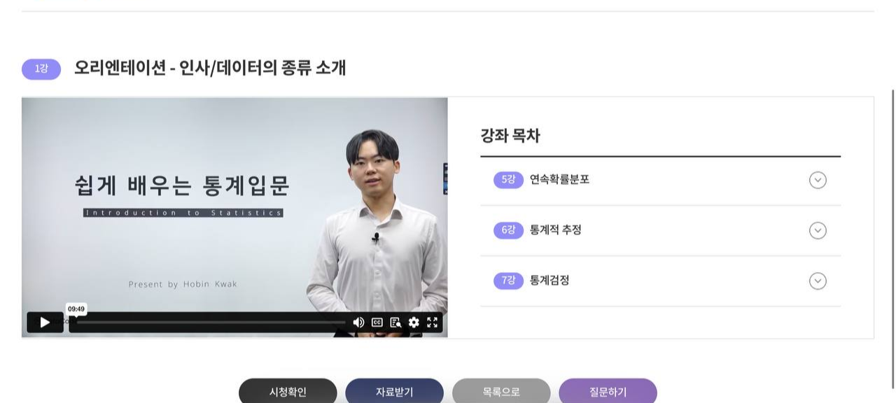 이 강의는 고려대 출신의 데이터 분석가인 곽호빈님이 진행하였다. 아래 사이트에서 수강할 수 있고 7개의 강의로 구성된 약 5시간까지의 강의다. 이번 글에서는 3강 확률과 확률변수의 내용까지 다룰 것이다.
