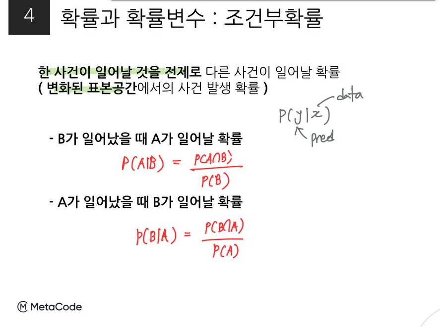 조건부확률은 특정 사건이 일어날 것을 전제로 다른 사건이 일어날 확률을 뜻한다. 데이터 분석 시, 데이터를 추가함에 따라 예측값이 어떻게 변하는지도 조건부 확률이 적용된 사례라고 할 수 있겠다. 예제로 A 속성의 고객이 B 제품을 구입할 확률 등이 있다.