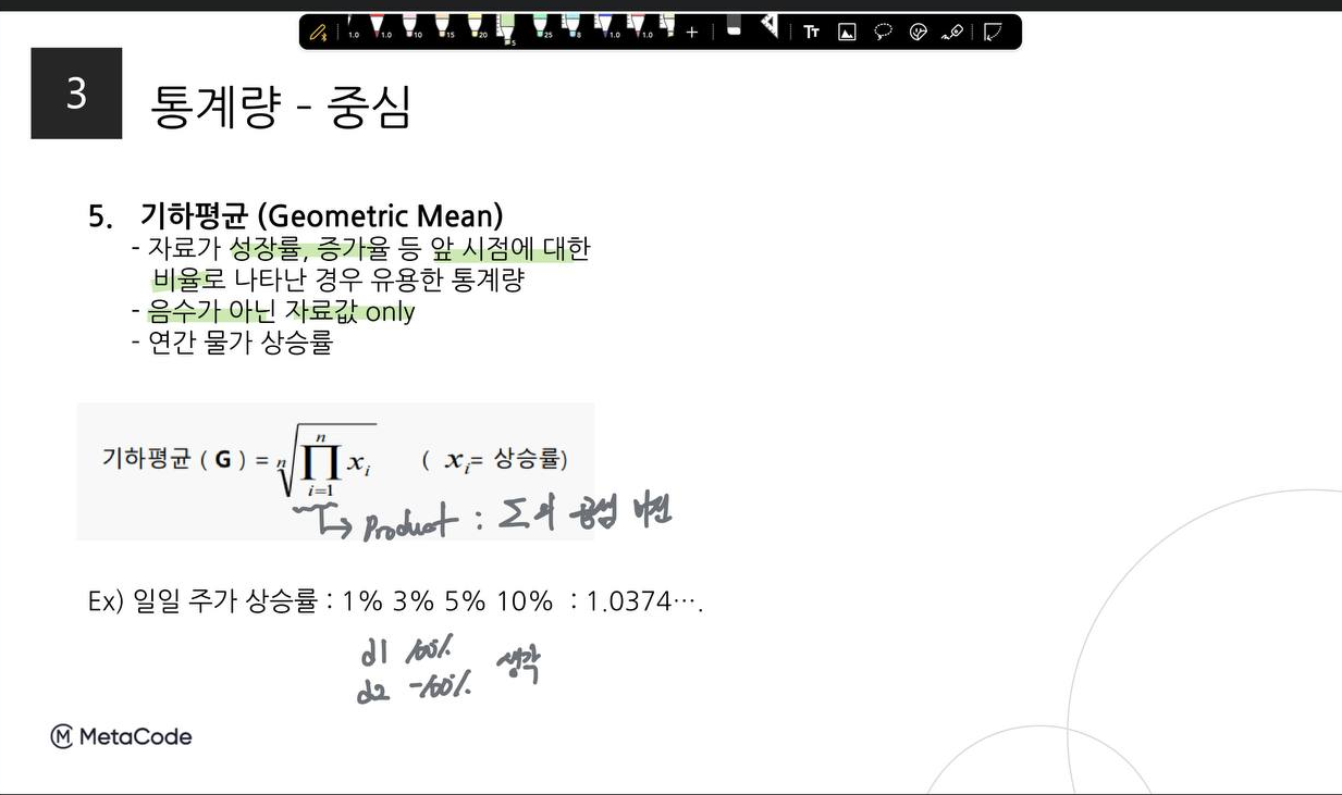 중심에서는 최빈값, 중앙값, 평균이 나오는데 이중 가장 생소했던 개념은 기하평균이었다. 기하평균은 이전 시점 대비 변화율을 나타내는 개념으로 5년간 평균 물가상승률 등을 나타낼 때 사용할 수 있다.