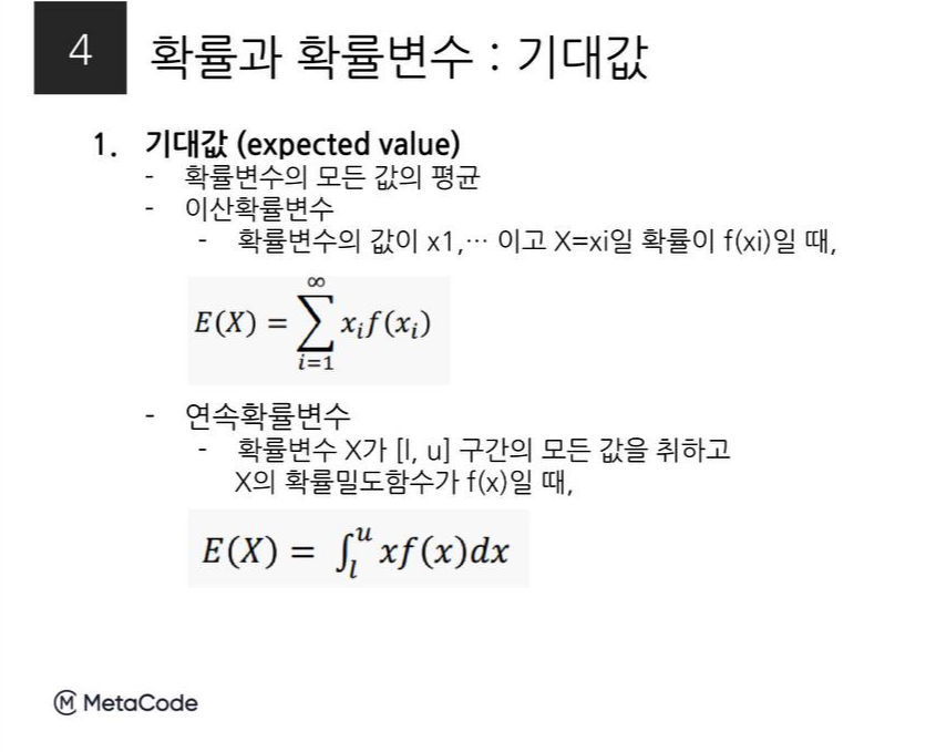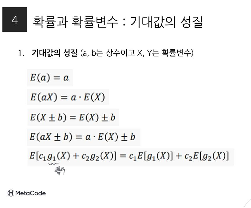 기댓값은 확률변수가 지니는 모든 값의 평균인데 확률변수의 유형에 따라 구하는 공식이 다르다. 또 다음과 같은 성질을 가진다.