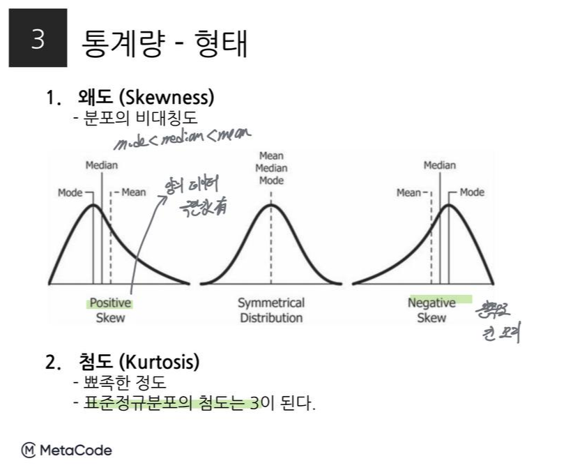 형태를 나타내는 통계량으로는 왜도와 첨도가 있다. 분포가 비대칭적으로 그려질 때, 최빈값과 중앙값, 그리고 평균이 어떻게 위치되는지 물어보는 문제는 데이터를 다루는 시험에서 자주 출제된다.
