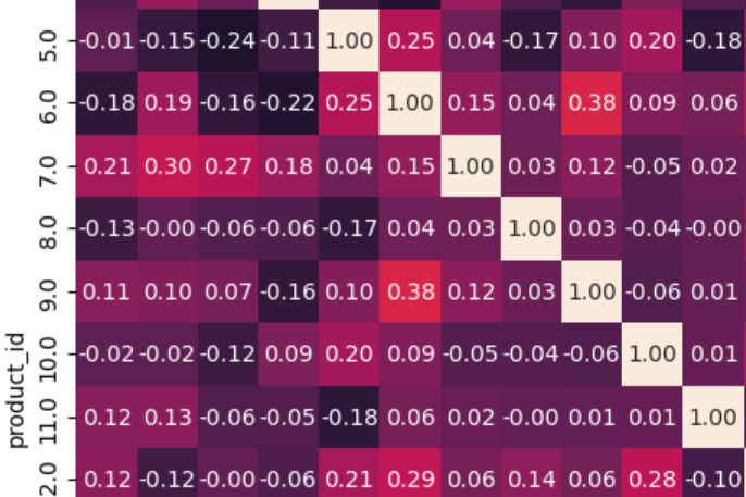 매출에 따른 제품별 상관관계를 분석했더니 6번과 9번 제품에서 양의 상관관계, 1번과 17번 제품에서 음의 상관관계가 발견되었다. 상관도는 seaborn의 heatmap을 사용했다.