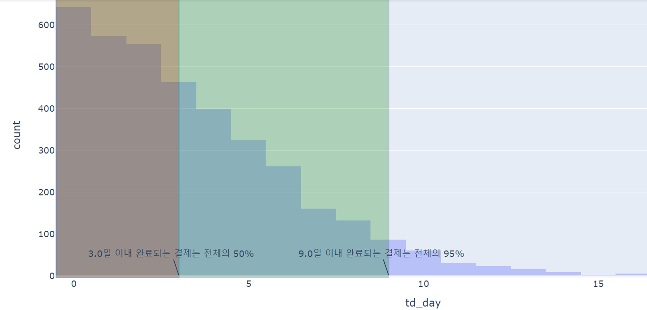 fig.add_annotation(x = p_50, text = f'{p_50}일 이내 완료되는 결제는 전체의 50%')